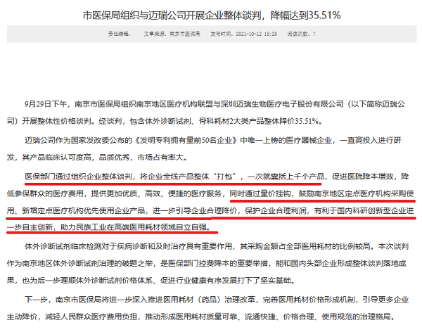 根據上述公告,此前在9月29日,南京市醫保局組織了南京地區醫療機構聯盟與邁瑞醫療展開整體性價格談判,聚焦於體外診斷試劑、骨科耗材2大類產品。最終整體降價幅度為35.51%。