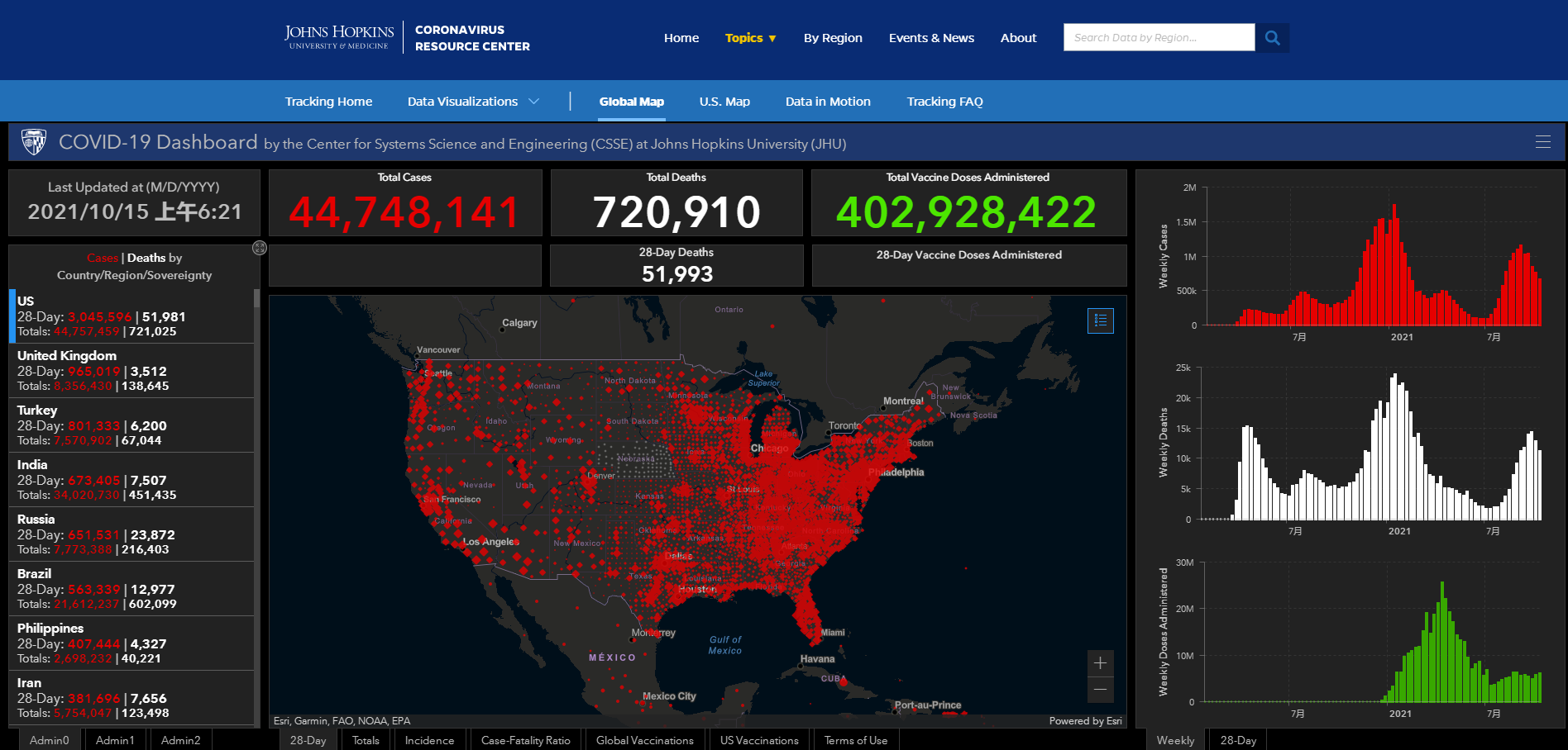 (觀察者網訊)根據美國約翰斯·霍普金斯大學統計數據,截至北京時間2021年10月15日6時21分,美國新冠肺炎累計確診病例達44748141例,累計死亡病例720910例。在過去24小時裏,美國新增確診病例80505例,新增死亡病例1604例。
