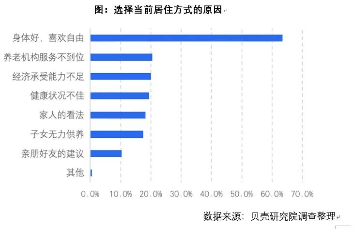 報告分析,老年人高獨居比例的表面原因是其認為自身身體好,喜歡自由,更根本的原因則是養老觀念的變化和擁有較充足的經濟資源。以50後、60後為代表的這一代人,經歷了經濟實力的增強、住房條件的改善和健康狀況的提升,不再僅僅滿足於生存型、基本保障型居住需求,開始逐步追求自由、品質的老年生活,在居住形態上則表現為越來越多老年人開始從被動獨居走向主動獨居。