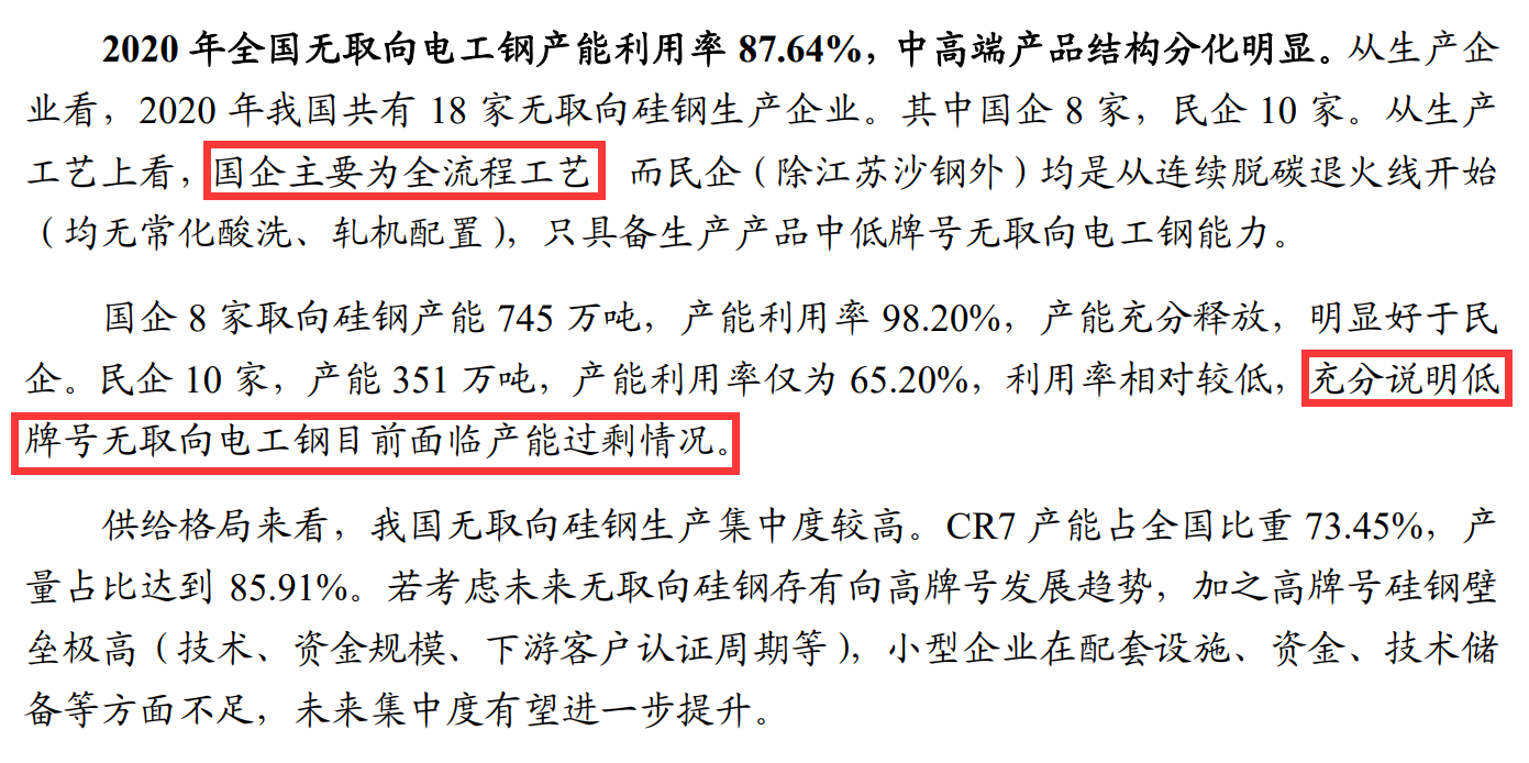 而中低牌號無取向電工鋼,目前又面臨產能過剩的問題。2020年,只具備中低牌號無取向電工鋼生產能力的民企,產能利用率僅為65.20%;具有高牌號無取向電工鋼生產能力的國企,產能利用率為98.20%。