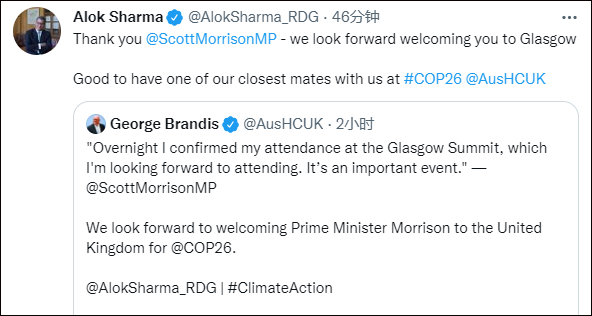 在莫里森做出上述表態後,英國高級氣候官員、COP26候任主席夏爾馬在推特表示歡迎。