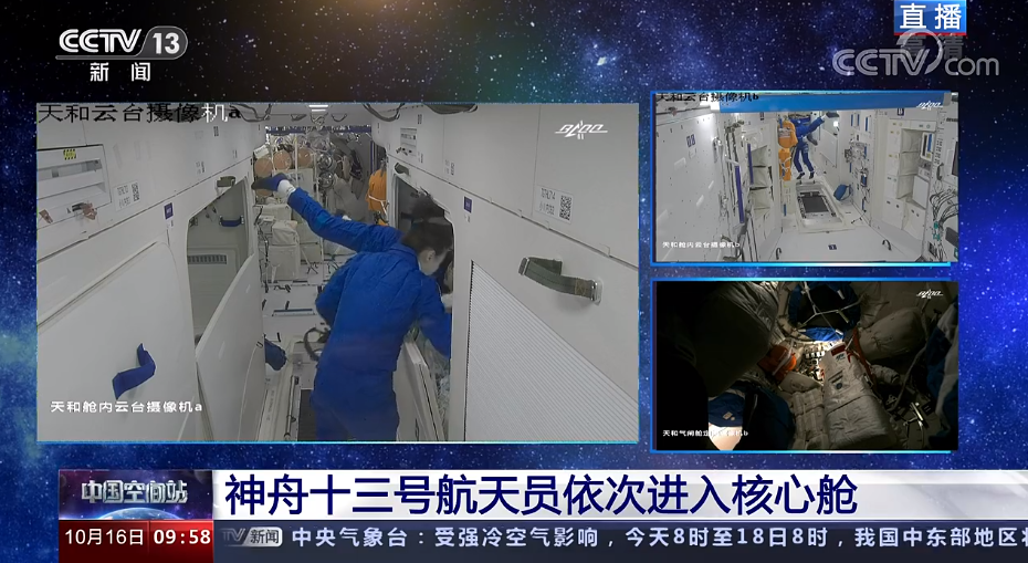微信公眾號“中國載人航天”消息,在神舟十三號載人飛船與空間站組合體成功實現自主快速交會對接後,航天員乘組從返回艙進入軌道艙。按程序完成各項工作後,翟志剛開啓天和核心艙艙門,北京時間2021年10月16日9時58分,航天員翟志剛、王亞平、葉光富先後進入天和核心艙,中國空間站也迎來了第二個飛行乘組和首位女航天員。後續,航天員乘組將按計劃開展相關工作。