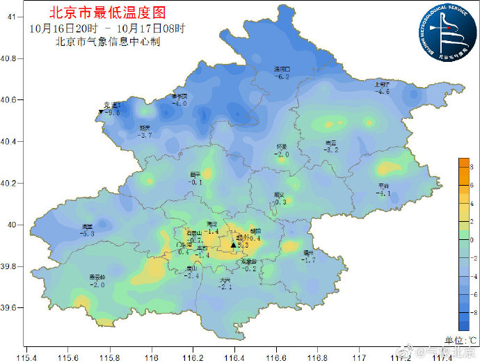 @氣象北京 10月17日消息,受寒潮天氣影響,今晨北京很多地方最低氣温首次跌破0℃。截至早晨8點,觀象台最低氣温為-0.2℃,出現在6點44分,為觀象台站1969年以來10月中旬同期最低值。