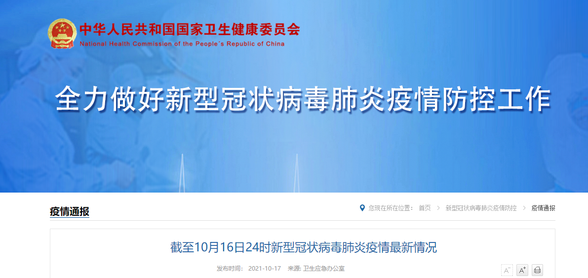 國家衞健委網站10月17日消息,10月16日0—24時,31個省(自治區、直轄市)和新疆生產建設兵團報告新增確診病例20例。其中境外輸入病例19例(上海5例,四川4例,廣西3例,雲南2例,北京1例,遼寧1例,黑龍江1例,浙江1例,陝西1例),含6例由無症狀感染者轉為確診病例(四川4例,浙江1例,陝西1例);本土病例1例(在內蒙古錫林郭勒盟)。無新增死亡病例。無新增疑似病例。