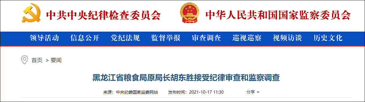 中央紀委國家監委網站10月17日消息,黑龍江省糧食局原黨組書記、局長鬍東勝涉嫌嚴重違紀違法,目前正接受紀律審查和監察調查。