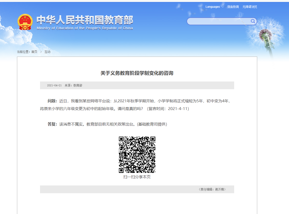 記者注意到,今年4月份,教育部官網“互動”版塊也出現類似2021年秋季學期開始將有學制變化的留言諮詢。教育部基礎教育司明確答覆稱“該消息不屬實,教育部目前無相關政策出台。”
