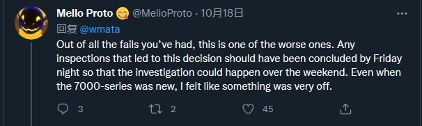 週一,華盛頓大都會區運輸管理局推特宣佈,由於上週華盛頓地鐵藍線阿靈頓公墓站出現的列車脱軌事件,運輸管理局決定暫停所有7000系列車的運營。