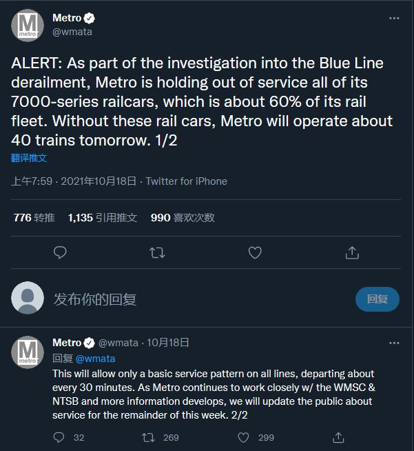 隨後,華盛頓地鐵安全委員會於17日下令,7000系列車在週一上午5點前停運。指令還稱:“直到地鐵公司制定計劃評估原因,並提供檢測和預防這些車輪裝配異常的措施之前,都需要停止運營。”