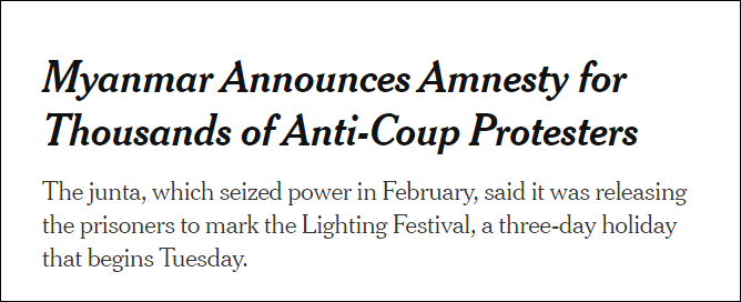軍政府表示,赦免囚犯原因是紀念從週二開始的為期三天的“點燈節”。但軍政府沒有明確釋放的人中是否包括,此前被趕下台的政府高級官員及領導人昂山素季等人。