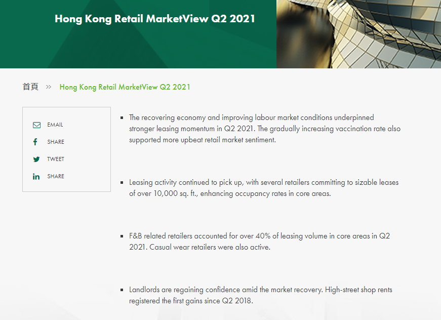 這份報告也同時指出,零售租賃市場的主要推動力來自於本土需求強相關的領域,如餐飲、雜貨、運動商店等等。另外,香港本地需求還帶動非核心區商場租金上升了3.7%。