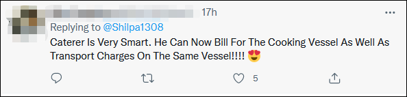 有人打趣道,“聰明的餐館人找到了生財之路,他們的大鍋現在成了烹飪之舟,可以收取運輸費了!!!!”