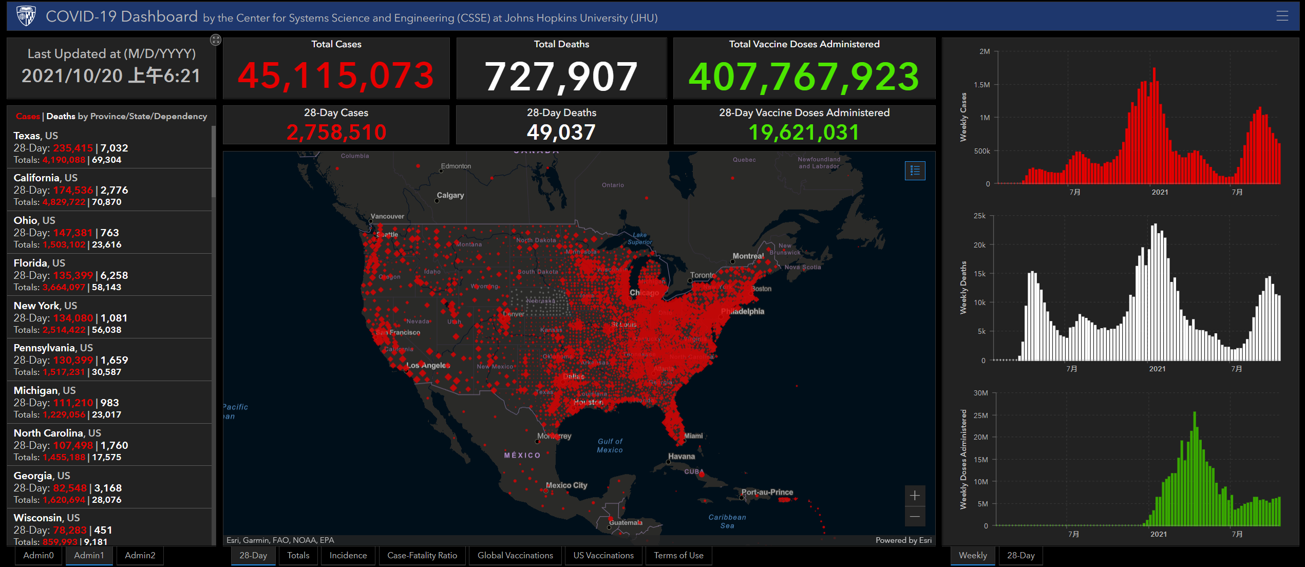 (觀察者網訊)根據美國約翰斯·霍普金斯大學統計數據,截至北京時間2021年10月20日6時21分,美國新冠肺炎累計確診病例達45115073例,累計死亡病例727907例。在過去24小時裏,美國新增確診病例74062例,新增死亡病例1810例。