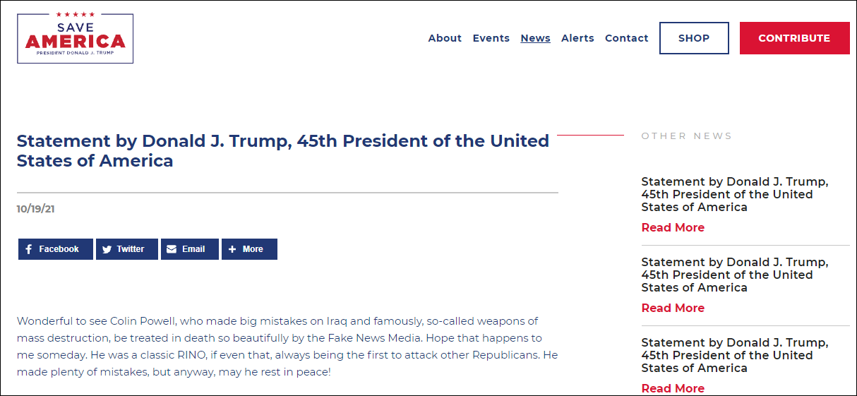 當地時間10月19日,特朗普在其個人網站發佈一份聲明,就美國前國務卿鮑威爾去世一事表態。