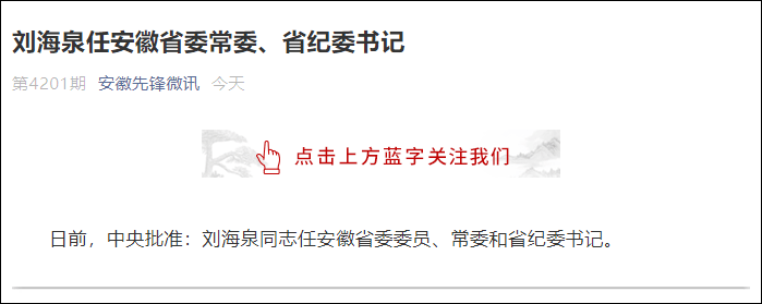 據安徽省委組織部微信公眾號“安徽先鋒微訊”10月20日消息,日前,中央批准:劉海泉同志任安徽省委委員、常委和省紀委書記。