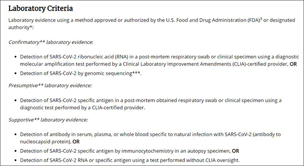 而其所謂“支持性實驗室證據”,意為:在樣本血液中檢測到自然感染(natural infection)的新冠病毒抗體(antibody),或在屍檢樣本中檢測新冠病毒特異性抗原(specific antigen),或在未通過美國“臨牀實驗室改進修正法案”(CLIA)認證的試驗中檢測到新冠病毒核糖核酸(RNA)或特異性抗原。
