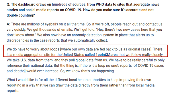 不過觀察者網查詢發現,上述作為JHU信源的數據聚合網站,其重要數據源也是“各地衞生部門”。更為有趣的是,作為JHU信源的數據網站“1point3acres”,反過來也將JHU的數據作為其信源之一。