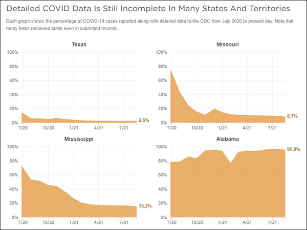 “儘管大多數州都主動(voluntarily)向CDC報告了各自的全部疫情數據,但少數州並沒這麼做。其中,得克薩斯州、密蘇里州、路易斯安那州、西弗吉尼亞州和懷俄明州向聯邦報告的數據甚至沒有其確診總數的十分之一。”