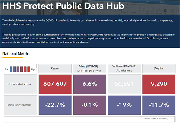 不過,HHS提供的信息顯然不如CDC全面。其“保護公眾數據中心”也僅僅展示了最近7天“確診總數”、“死亡數”等數據及變化趨勢。令人驚訝的是,觀察者網19日查詢時發現,其最新一次更新數據是在10月5日——僅數據發佈就滯後達至少14天。