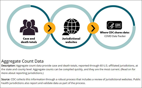 “疫情彙總數據”來自60個“美屬管轄地”(U.S.-affiliated jurisdictions)的報告。CDC的統計系統則會將各管轄地的數據彙總發佈在CDC的“疫情數據追蹤系統”(COVID Data Tracker)上。