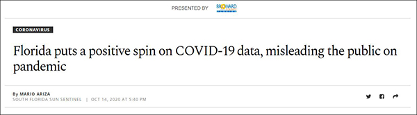 在疫情“重災區”佛羅里達州,被視為該州最有影響的報紙的《南佛羅里達太陽哨兵報》(South Florida Sun-Sentinel)在去年10月曾用“掩蓋”(obscured)一詞來形容“被人為壓低”的該州新冠“陽性率”。人們驚訝地發現,在3種計算“陽性率”的方法中,該州選擇了最具“誤導性”的一種。