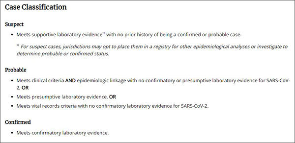 與世界衞生組織(WHO)對新冠病例分類相似,CDC也將“病例”分為三種情況:①疑似病例(suspect case)、②可能病例(probable case)和③確診病例(confirmed case)。