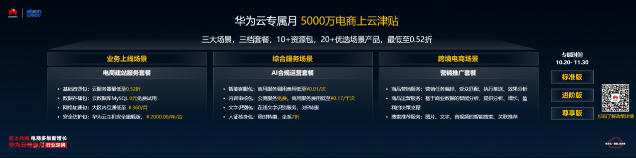 而為了更好地幫助電商企業降本增效、持續創新,促進行業升級,華為雲專屬月電商專項行動應勢而生,除了專屬的技術支持,資金支持,還將面向業務上線、綜合服務、跨境電商三大場景,提供10+資源包,優選20+針對性的雲產品,並有標準、進階、尊享三檔套餐滿足電商獨立建站、合規運營、營銷推廣等多種需求。
