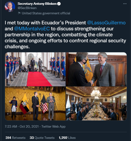 美國務卿布林肯20日會見厄瓜多爾總統拉索,推特截圖