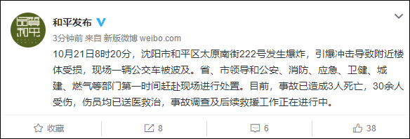 瀋陽市和平區委宣傳部官方微博(@和平發佈 )消息,10月21日8時20分,瀋陽市和平區太原南街222號發生爆炸,引爆衝擊導致附近樓體受損,現場一輛公交車被波及。目前,事故已造成3人死亡,30餘人受傷,傷員均已送醫救治,事故調查及後續救援工作正在進行中。另據遼寧省消防救援總隊官方微博消息,經偵查,初步判定現場為商住樓樓內爆炸。