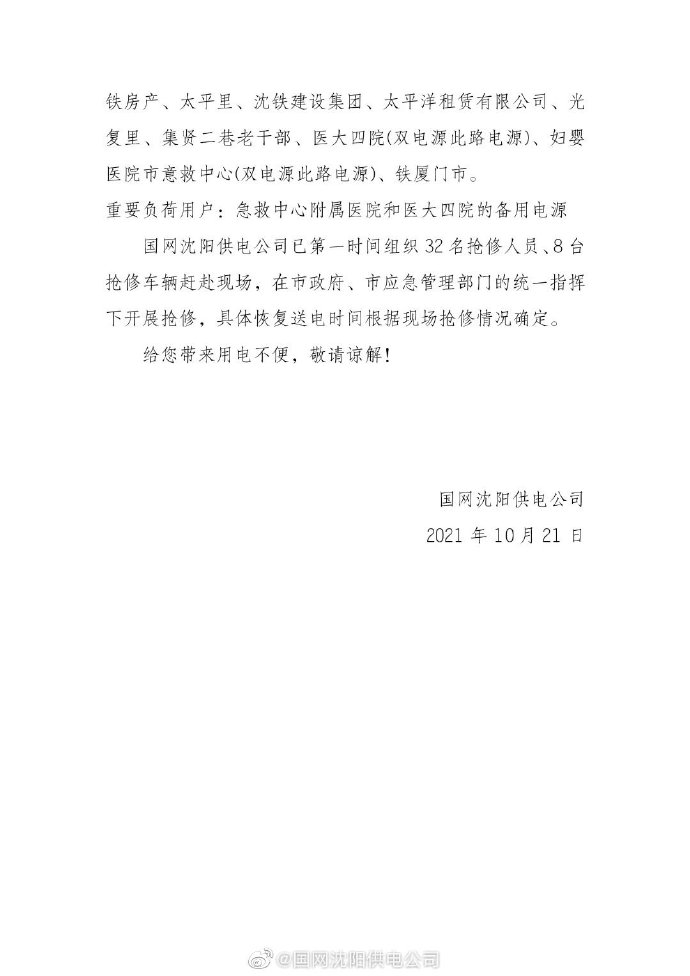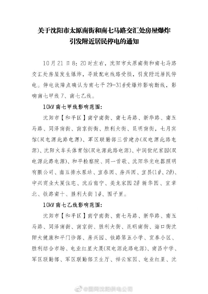 據國網瀋陽供電公司官方微博消息,瀋陽市太原南街和南七馬路交匯處房屋爆炸事故導致配電線路受損,引發附近居民停電。目前已組織開展搶修,具體恢復供電時間根據現場搶修情況確定。