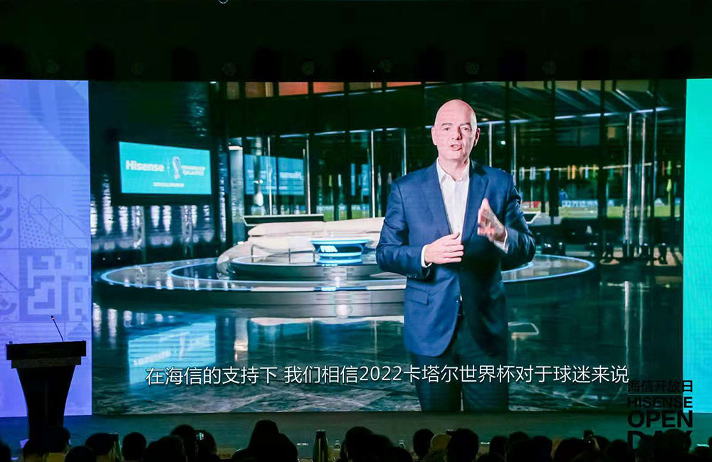 在海信開放日當天,國際足聯主席因凡蒂諾以視頻連線方式與海信聯合宣佈:全球科技企業領導者海信正式成為2022年卡塔爾世界盃官方贊助商。海信也因此成為中國唯一一家連續贊助4屆世界級賽事的企業。