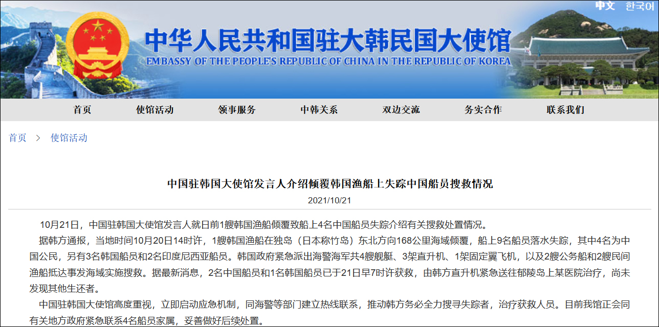 據韓方通報,當地時間10月20日14時許,1艘韓國漁船在獨島(日本稱竹島)東北方向168公里海域傾覆,船上9名船員落水失蹤,其中4名為中國公民,另有3名韓國船員和2名印度尼西亞船員。韓國政府緊急派出海警海軍共4艘艦艇、3架直升機、1架固定翼飛機,以及2艘公務船和2艘民間漁船抵達事發海域實施搜救。據最新消息,2名中國船員和1名韓國船員已於21日早7時許獲救,由韓方直升機緊急送往鬱陵島上某醫院治療,尚未發現其他生還者。