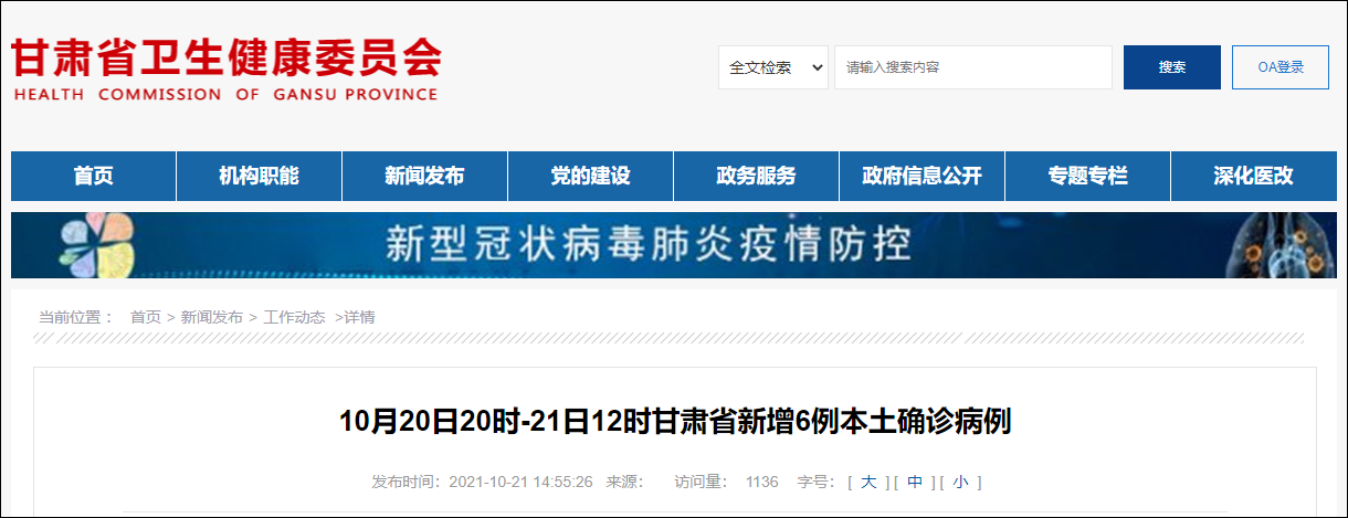 據甘肅省衞生健康委員會官網10月21日消息,10月20日20時-21日12時,甘肅省新增6例本土新冠肺炎確診病例。自2020年1月23日以來,甘肅省累計發現本土確診病例107例、無症狀感染者11例。現有本土確診病例15例、無症狀感染者1例。新增確診病例具體信息如下: