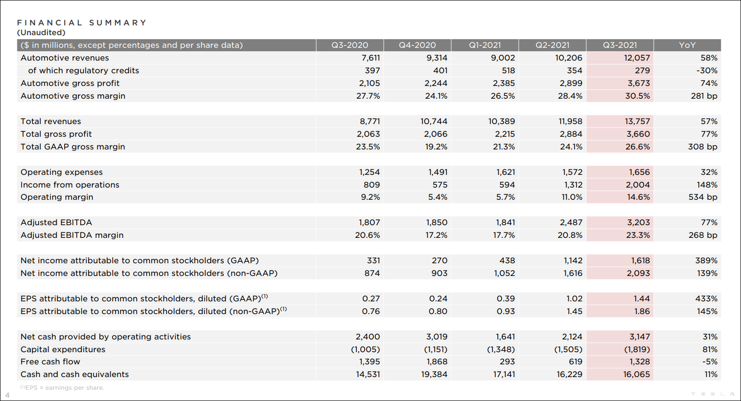 盈利方面,第三季度一般公認會計原則(GAAP)營業利潤為20億美元,營業利潤率為14.6%,超出該公司中期預期的“略高於10%”;特斯拉第三季度GAAP淨利潤為16.2億美元,同比增長389%(去年第三季度的淨利潤為3.31億美元),這是該公司淨利潤第二次超過10億美元,;非GAAP淨利潤(未計股份支付費用)為21億美元。