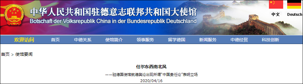 2020年4月16日,我使館還專門就德國輿論出現所謂“中國責任論”發佈《任爾東西南北風》一文,表明立場。