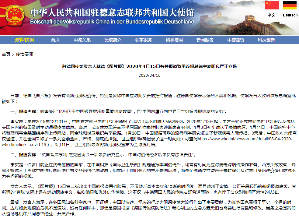事發當日(2020年4月15日),我駐德國使館網站刊登了發言人致該報總編室的德語公開信,就其拙劣報道表明中方嚴正立場,不厭其煩地為其梳理了中方履行通報信息義務的時間線,並於16日再次上傳了相關中文翻譯。