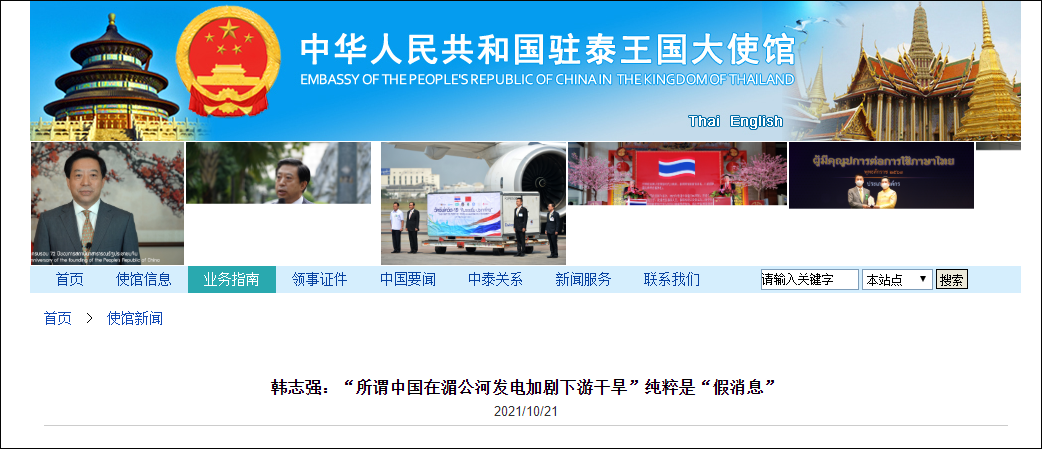 中國駐泰國大使館網站10月21日消息,10月20日,韓志強大使在出席同泰國主流媒體線上座談會期間回答媒體提問,表示中國境內的瀾滄江徑流量僅佔瀾滄江—湄公河全流域水量的13.5%,瀾滄江在中國境內消耗的水量不足瀾滄江—湄公河總水量1%, 所謂“中國在湄公河上游蓄水發電加劇下游乾旱”純粹是域外國家惡意挑撥瀾湄國家水資源合作的“假消息”。