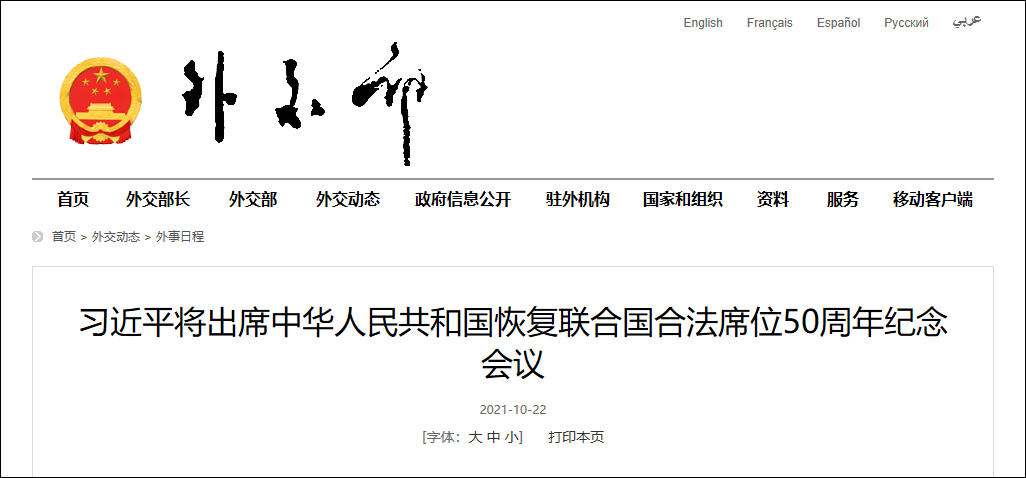 習近平將出席中國恢復聯合國合法席位50週年紀念會議 None 2021-10-22 據外交部官網10月22日消息,外交部發言人華春瑩宣佈:國家主席習近平將於10月25日在北京出席中華人民共和國恢復聯合國合法席位50週年紀念會議並發表重要講話。