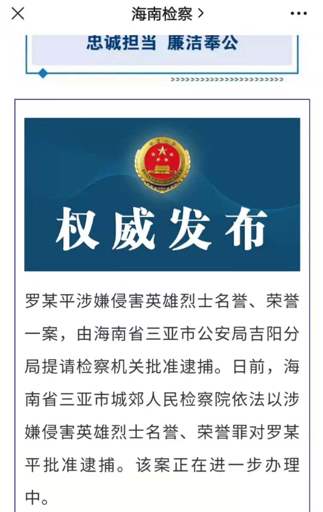 據海南檢察微信官方公眾號今日(10月22日)消息,羅某平涉嫌侵害英雄烈士名譽、榮譽一案,由海南省三亞市公安局吉陽分局提請檢察機關批准逮捕。日前,海南省三亞市城郊人民檢察院依法以涉嫌侵害英雄烈士名譽、榮譽罪對羅某平批准逮捕。該案正在進一步辦理中。