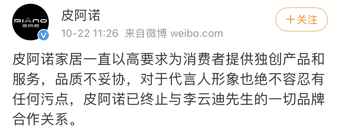 今天中午,櫥櫃品牌皮阿諾也宣佈與李雲迪解約,聲明表示,皮阿諾家居一直以高要求為消費者提供獨創產品和服務,品質不妥協,對於代言人形象也絕不容忍有任何污點,公司已終止與李雲迪先生的一切品牌合作關係。