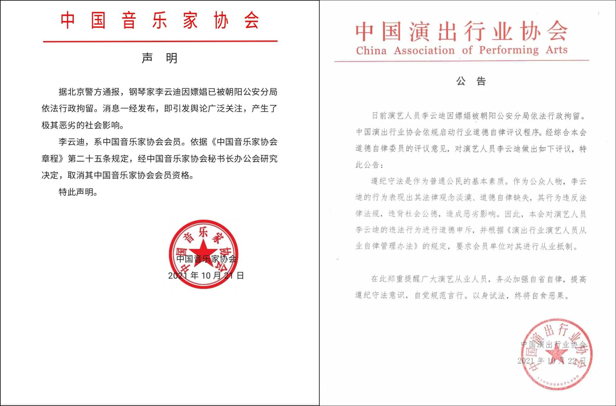 同時,中國音樂家協會也發佈聲明,宣佈取消李雲迪的中國音樂家協會會員資格。