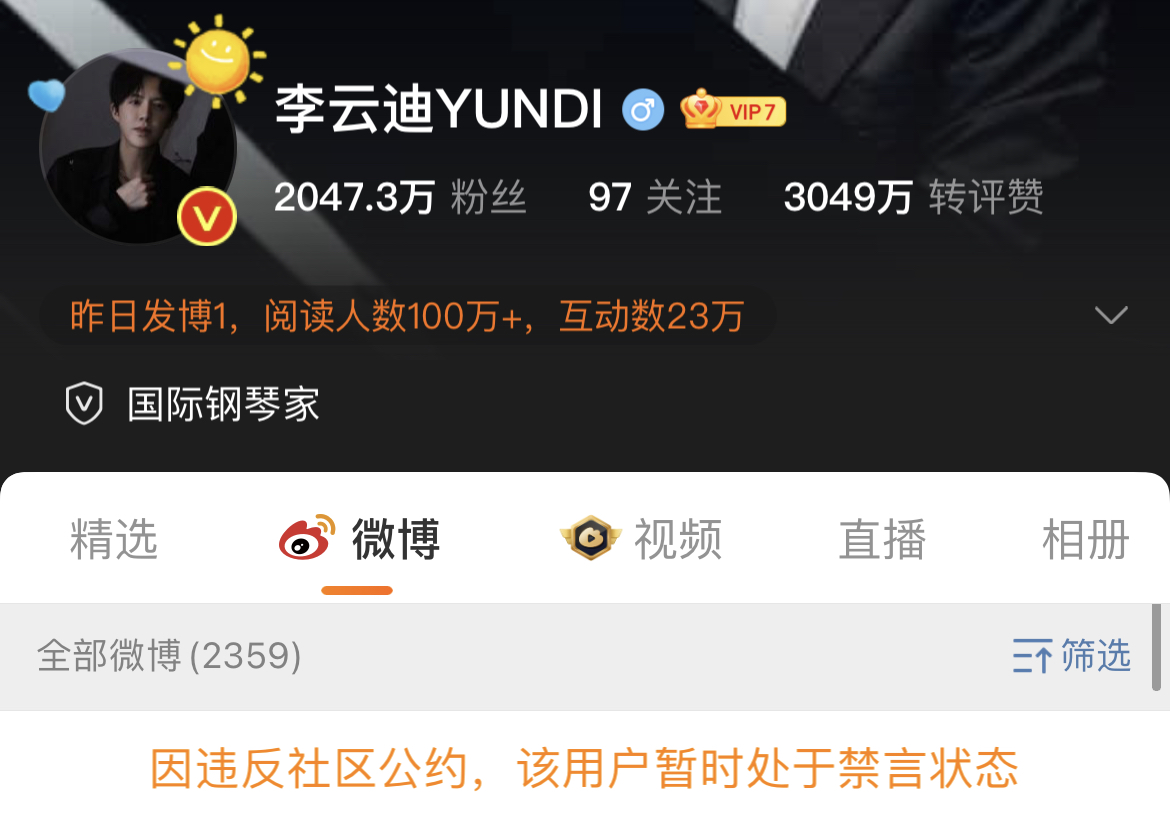 不光認證名稱被刪了,李雲迪的賬號還被禁言了。