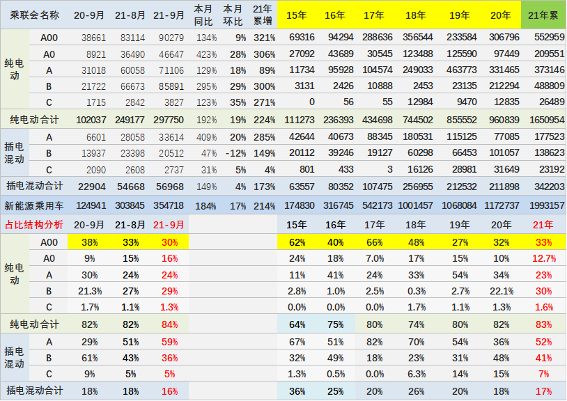 從市場結構來看,A00級車型仍然是拉動純電動汽車市場增長的重要助力,9月A00級車型的銷量為90,279輛,同比增長134%,在純電動市場佔比30%。繼A00級市場後,A級車和B級車市場成為純電動汽車市場的重要支撐,9月銷量分別為71,106輛和85,891輛,分別同比增長129%和295%。