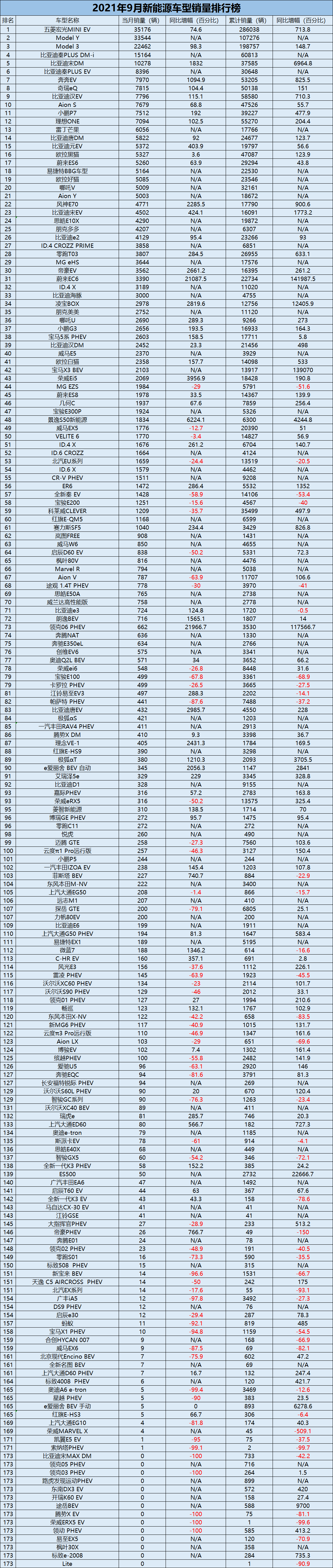 附:2021年9月新能源車型銷量排行榜
