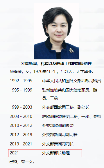 外交部網站“主要官員”欄目顯示,華春瑩的職務已更新為“分管新聞、禮賓以及翻譯工作的部長助理”。