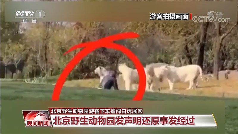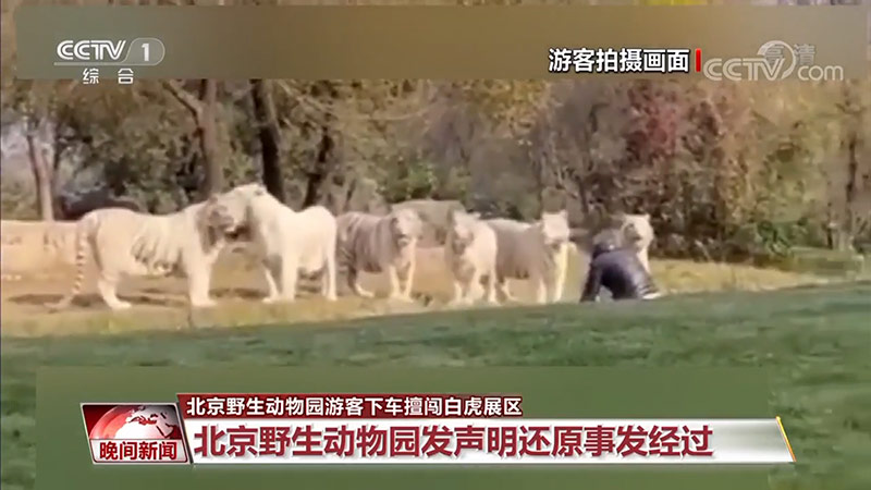 今天(10月24日)下午,“北京野生動物園”發表聲明稱,23日下午14時左右,北京野生動物園自駕遊覽區白虎展區發生遊客非法闖入事件,在施救過程中,闖入者始終未聽從工作人員的施救口令,與在展區內的11只白虎發生對峙,不斷用語言、動作挑釁動物。工作人員見狀向動物投餵食物,以分散其注意力,因為展區內有多重安全防護設施設備,其中一道隱蔽式裝置起到了關鍵的防護作用,使闖入者與動物之間始終沒有發生實質性的接觸。