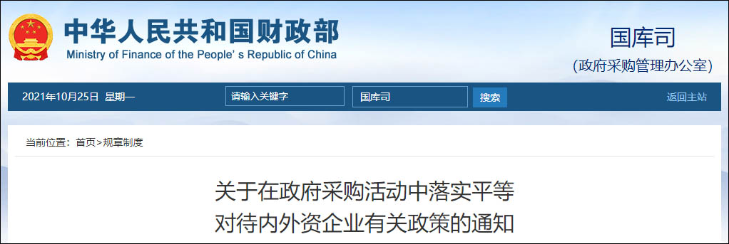 據財政部網站10月25日消息,財政部發布《關於在政府採購活動中落實平等對待內外資企業有關政策的通知》。《通知》要求,在政府採購活動中,除涉及國家安全和國家秘密的採購項目外,不得區別對待內外資企業在中國境內生產的產品。在中國境內生產的產品,不論其供應商是內資還是外資企業,均應依法保障其平等參與政府採購活動的權利。