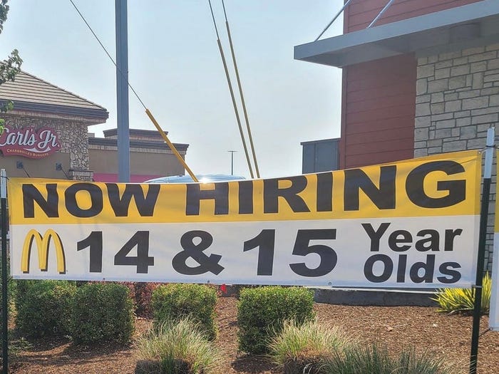 而如今,隨着美國勞動力短缺危機進一步加重,一些企業已經在利用青少年員工來填補用工荒。例如,在俄勒岡州,一家麥當勞正在呼籲十四五歲的孩子前去打工,在其懸掛的一條橫幅上,醒目地印有“現在招聘14-15歲的人”的字樣。