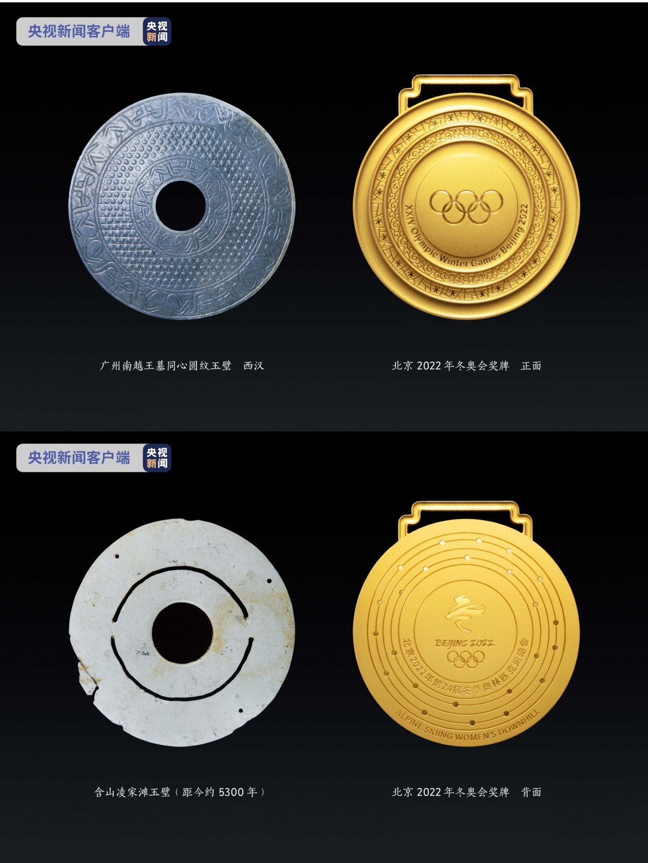 北京2022年冬奧會獎牌,由圓環加圓心構成牌體,形象來源於中國古代同心圓玉璧,共設五環。五環同心,同心歸圓,表達了“天地合·人心同”的中華文化內涵,也象徵着奧林匹克精神將世界人民聚集在一起,共享冬奧榮光。獎牌造型質樸簡潔,體現了北京冬奧會“簡約、安全、精彩”的辦賽要求,並與北京2008年奧運會獎牌“金鑲玉”相呼應,展現了“雙奧之城”的文化傳承。