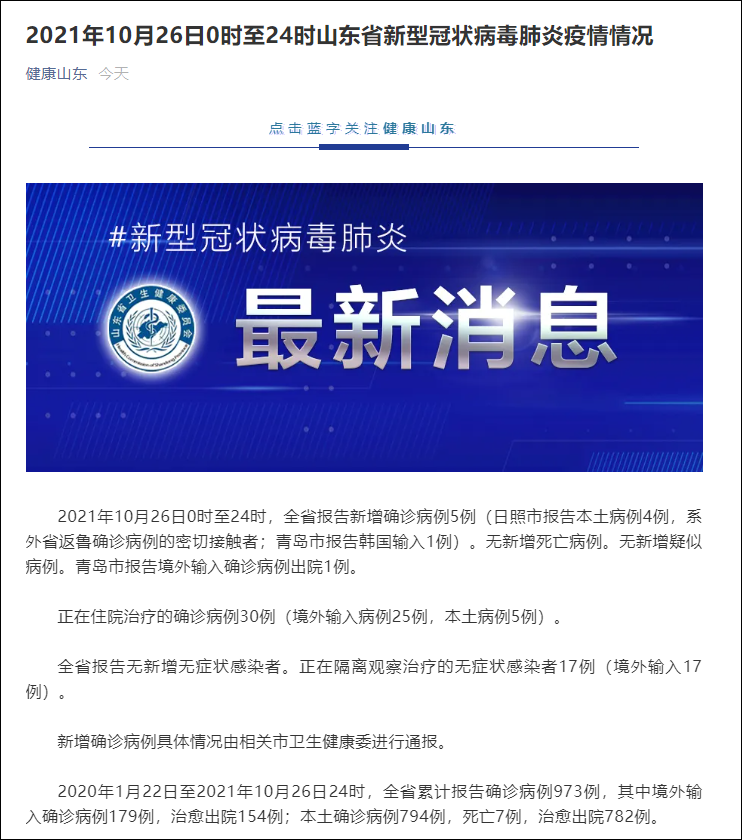 微信公眾號“健康山東”消息,2021年10月26日0時至24時,山東全省報告新增確診病例5例(日照市報告本土病例4例,系外省返魯確診病例的密切接觸者;青島市報告韓國輸入1例)。無新增死亡病例。無新增疑似病例。青島市報告境外輸入確診病例出院1例。