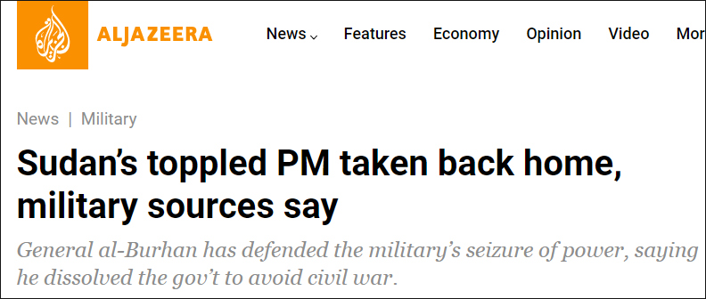當地時間25日凌晨,蘇丹軍方突然發動軍事政變,抓捕並軟禁哈姆杜克及多名內閣部長。布爾漢25日宣佈國家進入緊急狀態,解散主權委員會和過渡政府,並解除所有州長的職務。